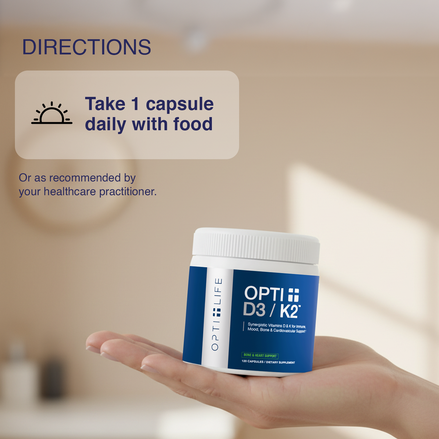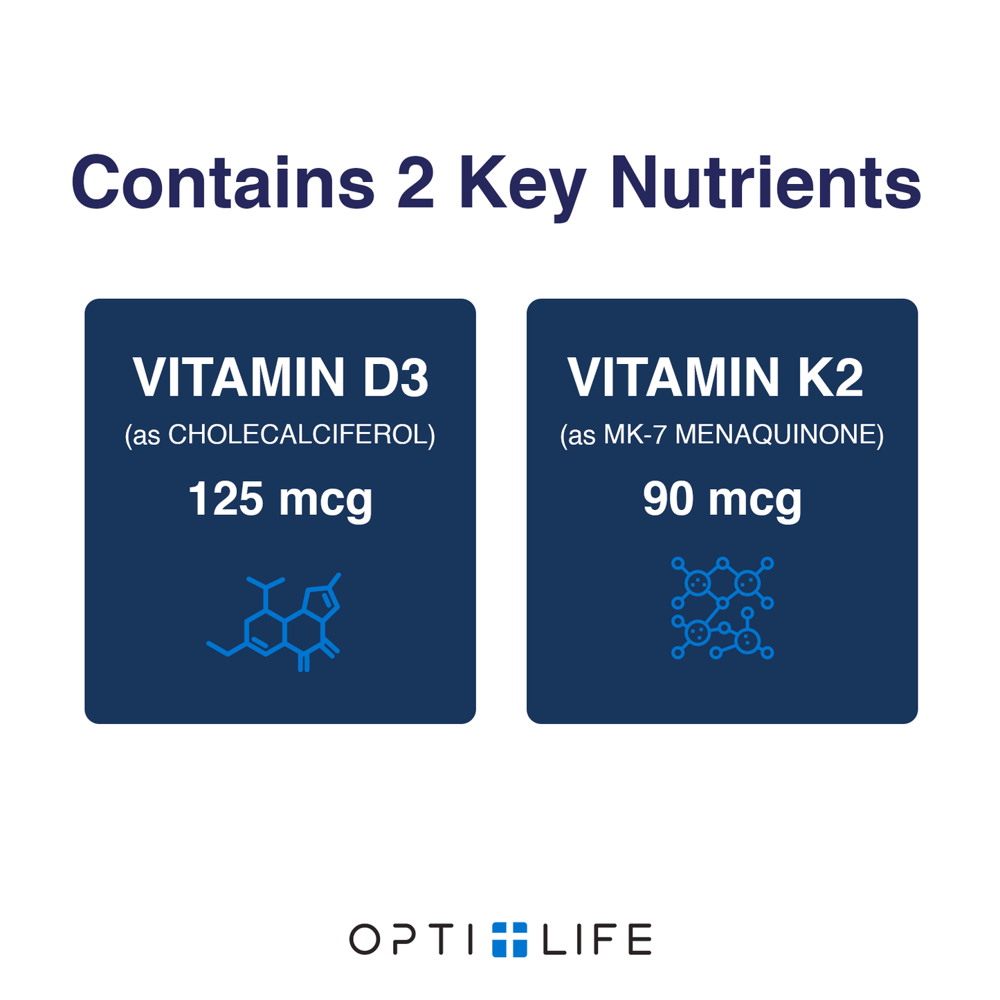 OPTI + D3/K2™ promotes strong bones by optimizing calcium absorption into the bones and teeth while preventing calcification in arteries and soft tissues. 1 2 3 4 5 Vitamin D3 and K2 work together to enhance bone density and protect against cardiovascular issues 4 5 8 9. Additionally, this powerful duo improves the absorption of omega-3 fatty acids, amplifying their benefits for heart health and inflammation reduction5 8, making it the perfect companion to your omega-3 supplement regimen.