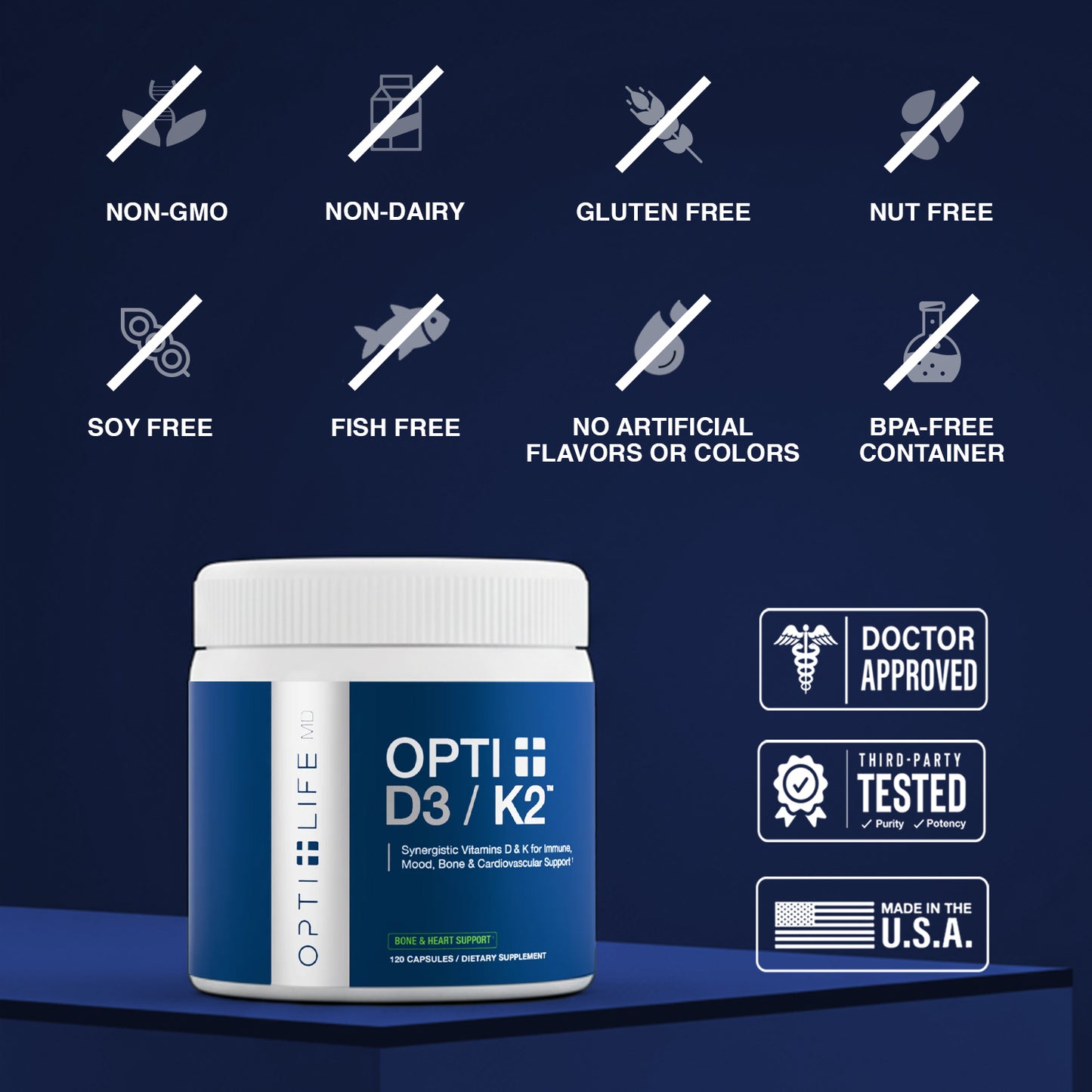 OPTI + D3/K2™ is tested by third-party labs for heavy metals, microbes, allergens, and other contaminants to ensure it meets FDA purity standards.